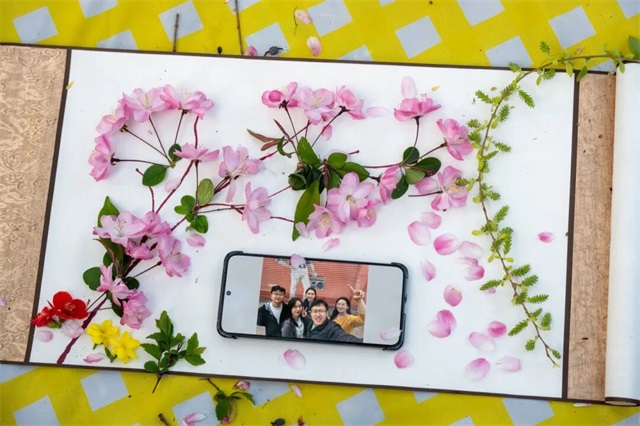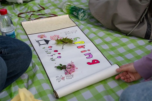 我们为每个小组准备了空白画轴与胶水,邀请大家以落花为材、以创意为笔,共同完成一幅春日实体画作。各组成员就地取材,将飘落的海棠花瓣、嫩绿枝叶精心拼贴,原本零散的自然素材在巧思之下化作一幅幅独具匠心的画卷。
